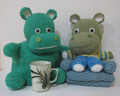 The size of the Hippo Tea Cozy (inside of the body) is 7 inches top and 7 inches diameter. The Hippo Tea Cozy can keep worm your large teapots. Knitkinz are cute stuffed knitted animals. You can find a lot of Knitkinz animalss in knitvana.com website or in “knitvana” on Ravelry. In these patterns we are brining Knitkinz Hippo - 14 inches tall.