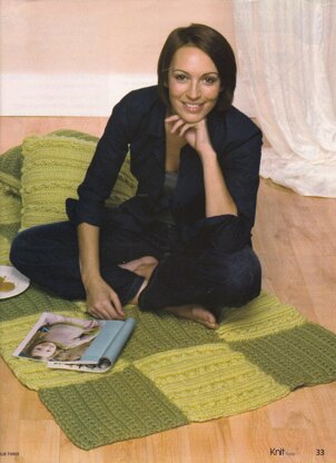 This is a pattern for a Two Textured Throw, originally published in Knit Today issue 3. It is made up of individual squares in tow textured rib stitches. The yarn is chunky and quick to knit. It may be fine for one step beyond beginners. The squares on the throw are sewn together in different directions. the cushion cover has a square of each stitch pattern. Photo Knit Today.