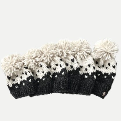 The Modello Hat Set features a color block design + a simple fair isle stitch pattern with a heart-shaped appearance. The 1x1 ribbed brim provides extra warmth around the ears. Top this beanie with your fav faux fur or yarn pom. Fun fact: Modello means "model" in Italian.