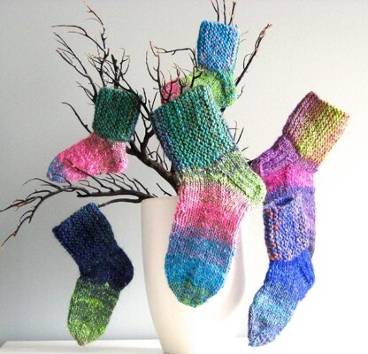 These infant to age 8 yrs “Hiking” socks will become a year ‘round favourite for both indoor and outdoor use. The quick and easy to knit design starts with a provisional cast on and continues into a sideways knit garter stitch cuff. The cuff is completed by grafting the two ends together. Stitches are picked up from the cuff and the sock then becomes a conventional top down design. Do not be put off by the word “hiking” - These cozy socks work well as warm and comforting boot socks or slipper socks, making them also perfect for indoor wear. The design is written for 4 different sizes, ranging from 6 month to 8 years. This design also comes in a separate adult pattern - "Happy Hiker" Socks with sizes ranging from small to ex. large.