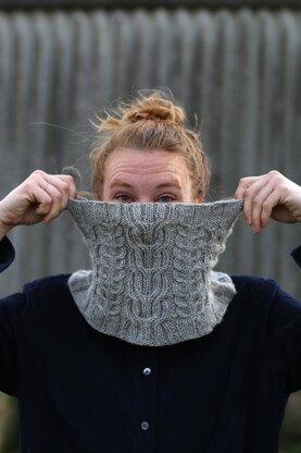 Tyto Alba is worked from the bottom up in the round and features a striking central cabled panel complemented by a slipped stitch pattern to create a warm, bouncy fabric for those chilly days. The difference in the row gauge of the two patterns is used to positive effect, creating a dramatically shaped front section which sits perfectly where your coat closes; at the back there is less bulk, so the cowl sits comfortably against the back collar. Short rows are worked at the top of the cowl back to keep out those chilly winds!