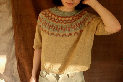 Udo is knitted from the top down, seamlessly. Throughout the process, several series of short rows are used for a comfortable and beautifully shaped finish. The color work yoke is followed by some raglan increases. Sleeve stitches are set on hold, the body is knitted straight on to bottom hem. Then sleeves are knitted in the round also. The pattern provides instructions for two sleeves options: elbow length sleeves and long sleeves. At the end, the stitches of the neckline are picked up to knit the collar. It is knitted in 1/1 rib and Tubular cast-on method is explained for a neat finishing.
