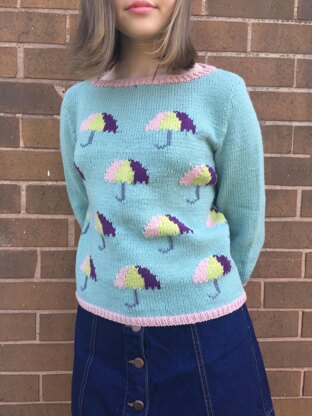 This jumper is knitted at in four pieces and seamed, with intarsia umbrella motifs on the front panel. The umbrella handles are worked in duplicate stitch (aka Swiss darning) at the end. The three-quarter-length sleeves are trimmed with contrast rib, as are the collar and hem.