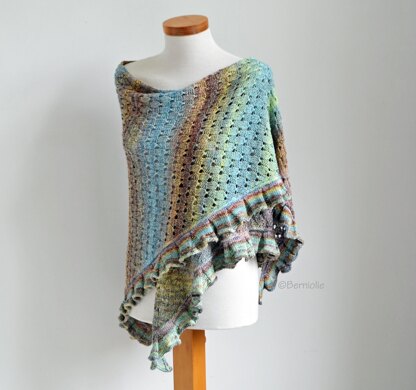 This is a triangle shawl, knitted sideways. After that you add the lovely ruffled border.