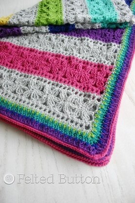There's something delightful about sitting outside with a little crochet, sipping some lemonade and enjoying a cool breeze. That's what I had in mind when I designed this. With fun cabana-like stripes and simple chained flowers, the lightweight and drapey nature of this blanket is perfect for warmer weather.