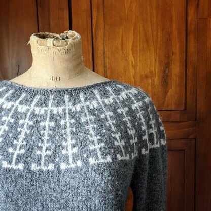 This sweater is worked seamlessly from the top down, starting with a stockinette stitch neckline. The stranded yoke is worked, then short-row shaping is added on the back. The sleeves and body are separated and worked top down.