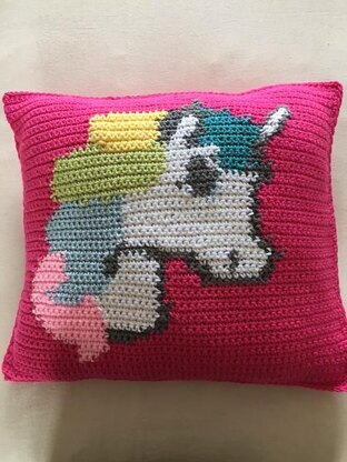 Patron pour coussin avec Licorne- facile à réaliser Il couvre un coussin de 18" X 18" (46cmX46cm) Demande 1 balle de laine d'environ 253m pour la couleur principale et les autre couleurs demandent environ 80m chacune Laine de grosseur Moyenne 4 Une page PDF est jointe avec le dessin du patron à suivre