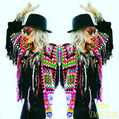 Crochet pattern for lush festival feels every day with this bright Boho chic hand crocheted Granny Square fringed cardigan.