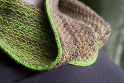 This cowl uses layered and colour-shifting yarns to suggest the secrets and surprises of the changing seasons; first buds, or layers of fallen leaves. The rhythmic stitch pattern is as satisfying and addictive as a walk in the woods, while creating a wonderfully squooshy fabric that traps air for maximum warmth.