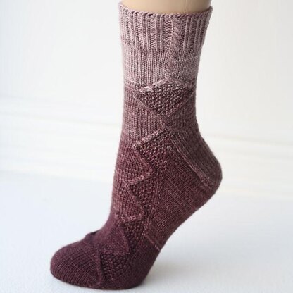 A combination of cables and moss stitch panels decorate the sides of these toe-up socks, with the leg pattern continued in a slightly more simple form on the foot.