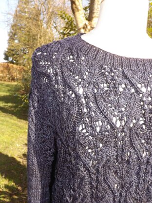 Usus is a loose fit pullover worked from the bottom edge and up with a textured lace pattern on the body. The pullover has long sleeves with a combined raglan/modified drop sleeve construction.