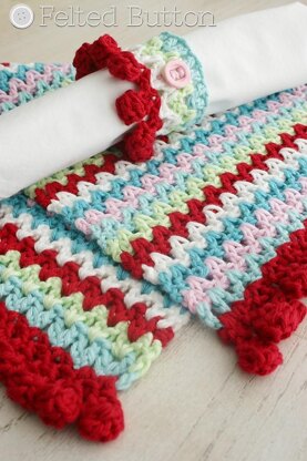 Using a simple but whimsical V-Stitch, this placemat pattern is fun to give as a gift or use for your own decorating for that special occasion. Add the simple little napkin ring and you've got a table setting that even Martha Stewart might envy. And isn't that pom edging just so modernly retro?! Want a scarf, or table runner, or blanket? You can make that, too, with the simple multiples number included in the pattern, change up the dimensions. Bust your stash and make a non-matching set for a playful table setting.