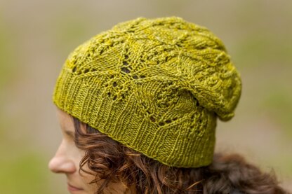 Vaahtera is a DK-weight lace beanie with slightly slouchy shape. Size modifications can be done based on gauge and yarn weight, see details below. **Sizing:**Child(Woman) Finished measurements, to fit the head circumference of approx. 21-22(22.5-23.5)”/52-54(56-58)cm. The sample in the photos is Woman size and knitted in Kettle Yarn Co. Beyul DK in colorway Steppe.
