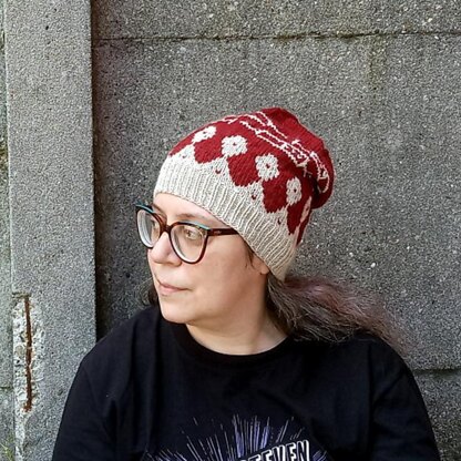 On Monday 31 May I am getting the first shot of Covid vaccine. On this day I publish this celebratory beanie. The hat is knitted with stranded motives in the round from the bottom up. The lower ring of drop-shaped motives is supposed to imitate the proteins spikes of the SARS-CoV2 virus, while the top is crowned with a double ring of syringes. If you prefer you can use another motif that I included in my pattern. This stranded hat is a one size fits all, and should adapt to all adults’ heads. You will need one skein of each color of Nimbus.