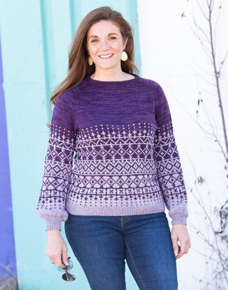Vaila is a top down seamless raglan sweater with a Fair Isle motif that starts just after the sleeve/body divide and gradually inverts from MC to CC towards the hem and the cuffs. The increases in the yoke are worked in a compound raglan for the smaller sizes, and raglan and radial increases for the larger sizes. There are short rows at the back of the neck to create a comfortable fit. The lantern sleeves are straight along the length of the sleeve, with no decreases. Just before the cuff, the stitches are decreased to form a fitted cuff. The hem and cuffs are finished off in ribbing. The body has optional waistline shaping for a flattering fit achieved by changing needle size.