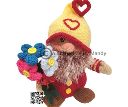 His heart on his hat and the flower stems are knitted using the iCord method and full instructions are given in the pattern. I added a small amount of acrylic paint to add a sparkle to his eyes and blusher to his cheeks giving him a rosie glow.
