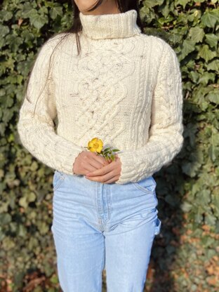 The Valerie Turtleneck is a warm aran turtleneck made up of cables, and textured stitches. It is a cropped turtleneck ideal for autumn and winter.