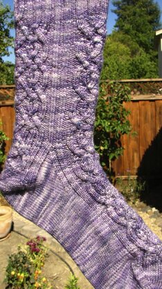 A heavily cabled sock, Varda features rest rows, and a patterned heel flap. The sock is exclusively available through the Claire Ellen Sock Club until Sept. 2014, or via kits from Wooly Wonka yarn.