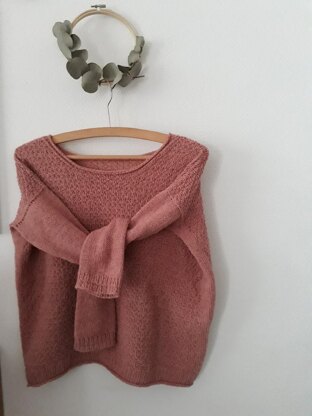 It’s a relaxed, boxy fit sweater with sleeves on the tighter side. The front and back are worked in a beautiful textured pattern, while the sleeves are worked in stockinette stitch. The neck is larger than a usual crewneck and finished as well as the hem with a little roll-edge.