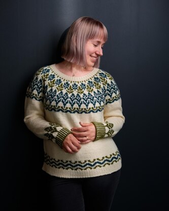 This sweater is worked top-down seamlessly. The sweater has a round yoke with lovely greenery pattern. The sweater has long sleeves with more sprouts just before the cuff ribbing and the hem has a little pattern as well. There are instructions for an optional bust dart.