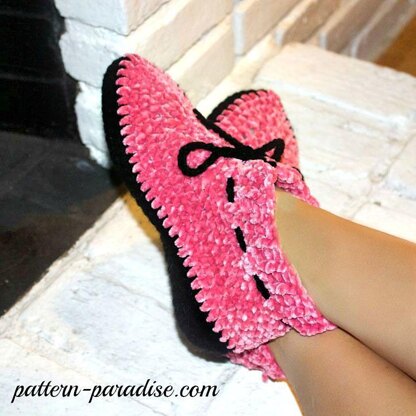 These slippers are cozy, warm and soft as silk in Red Heart Velvety chenille yarn, but they look great in other yarns too. The drawstring keeps them securely on the feet and it’s a fun place to add a pompom or tassel too.