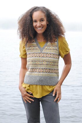 Fair Isle vest with classic OXO pattern motifs that knits up quickly using a DK weight yarn. Knit in the round from the bottom up, with steeks for V-neck and arm openings. A good project for knitters new to stranded knitting and entertaining enough for experts!