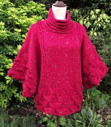 With gorgeous chunky cables and gentle-fit ridged funnel neck this over-top is a real winner. The sleeves appear to be worked all in one with the back and front. But this is not the case, the sleeves are worked separately sideways, with no shaping, and then stitched to the yoke with mattress stitch. The simplicity of the shape adds chic to this design. I chose this lovely rich, warm red as it is typical of historical venetian costume colours - hence the design name! But would look wonderful in any colour.