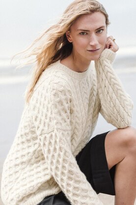Pullover has an asymmetric pattern on the body and a differ- ent pattern on each sleeve. Pullover is worked flat in pieces and seamed. The collar is picked up and worked in the round. Pattern has options to make either a men’s or women’s sweater. The women’s version is shorter through the yoke, lower body and sleeves.