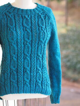 Construction: The back and front hem are worked separately and then joined together in the round until the armhole shaping. The back and front are then separated and worked in rows. The sleeves are worked in the round from the cuff up, and then the raglan shaping is worked back and forth in rows. The raglans for the front, back and sleeves will then be seamed together. The neck will be picked up and worked in the round. The Lacy Cable pattern is available written and charted. Choose which format you prefer.