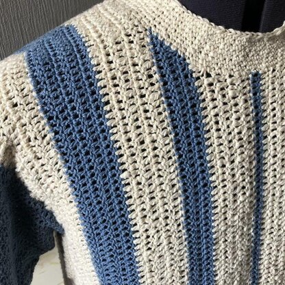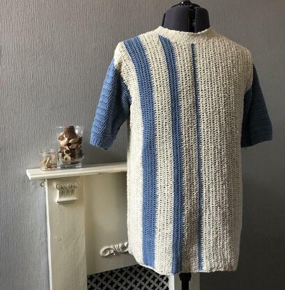 Men's Crochet Pattern, Vertical Stripe Round Neck T-Shirt Skill Level: Intermediate US Crochet Terms This crochet pattern is for a men's t-shirt with vertical stripes. Anyone who knits or crochets knows that vertical stripes can be hard work when made bottom to top of a garment, so I have designed this t-shirt to be made sideways. Crochet rows go from hem to shoulder, so there is no complex colour changing or carrying yarn across. The design features three stripes that continue from front to back, across the shoulder. The pattern was designed using DK cotton, so the t-shirt is light and cool. The garment is made in three pieces, with the back and front made as one, and then sewn together. The instructions include lots of detail to ensure complex shaping is made easy. There is a lot of stretch in the finished item, so the sizing is only approximate. I have listed this pattern as "intermediate" because of shaping and pattern techniques.