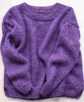 Yarn requirements for this sweater: Hobbii Soft Alpaca Lace: Colour 11 – 3 balls (1200 m) Drops Kids Silk: Colour 16 – 5 balls (1050 m) Ito Sensai: Colour 314 Prune – 4 balls ((1050 m) In total you need about 3000 m of yarn to make this sweater.