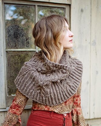 Vespertine is an ode to all things that come alive at night. Cables and bobbles inspired by vining moonflowers are knit in lofty, super bulky weight wool and bordered in twisted ribbing. Increases incorporated into the stitch pattern create an a-line silhouette, draping the cowl gently around your neck or over one shoulder.