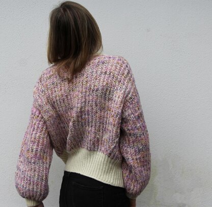 VesterbyCrea No.25 is a jacket/cardigan worked in half fisherman´s rib. It is a top-down model. The back piece is worked in half fisherman´s rib at the beginning of the yoke. The front pieces are worked one by one with increases. The front pieces are worked flat in the same way as the back piece in half fisherman´s rib. The body is worked flat in half fisherman´s rib by joining the back and front pieces. The body is finished with a wide ribbing and stretchy bind off. Sleeve stitches are picked up along the armhole and worked in the round in half fisherman´s rib and finished with a ribbing and stretchy bind off. Button bands are worked in ribbing with 4 buttonholes. Button bands are sewn together in the neck to create a bent edge.