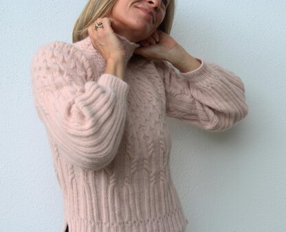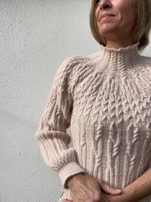 VesterbyCrea No 31 is a fitted sweater with cables. The model is worked top down. In the beginning of the yoke the neck is worked in the round with cables. The yoke is worked in the round with increases and cables. The body is divided for sleeves and continued in the round with cables. The body is finished with a ribbing first working in the front and then in the back and finished with stretchy bind off. Stitches are picked up along the armhole and worked in the round with cables. Sleeves are finished with ribbing and stretchy bind of. The sweater is assembly free.