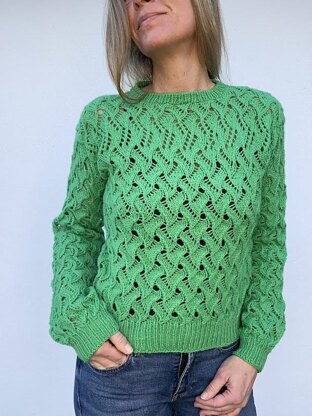 VesterbyCrea No 40 is a sweater worked in lace pattern. The model is worked top down. In the beginning of the yoke the back is worked in lace pattern. The front pieces are worked one at a time with a few increases and then joined to one front piece. The front piece is worked flat in the same way as the back piece. The body is created by joining the front and the back piece and then worked in the round in lace pattern. The body is finished with a ribbing and stretchy bind off. The sleeves stitches are picked up along the armhole and then worked in the round in lace pattern and finished with a ribbing and stretchy bind off. The neckline is worked by picking up stitches and then worked in the round in ribbing and italian bind off. The sweater is assembly free.