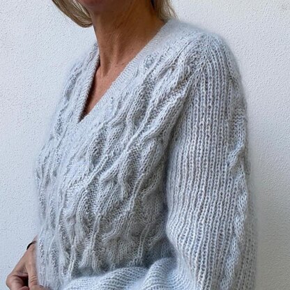 VesterbyCrea No 11 Wool is a sweater with a V-neck. It is worked with braids on body and sleeves. VesterbyCrea No 11 is worked top down in two strands of mohair. Start by knitting the yoke flat including the fronts, back and sleeves with braids. Raglan increases are worked on sleeves, front and back. The V neck is worked with increases on every second right row. After working increases for V neck the sweater is connected in the round. Then body is worked with braid pattern. The body is finished with ribbing and stretchy/italian bind off method. Sleeves are knitted by moving sleeve sticthes on to main needle and picking up and knitting underarm stitches when you come to them, and then worked in the round in ribbing and braid pattern is placed on mid sleeve. Sleeves are also finished with stretchy/italian bind off method. V neck is worked in ribbing by picking up stitches along the V neck. It is recommended to knit the V neck before finishing the body, as V neck can pull the body a