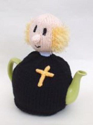 The vicar tea cosy is handcrafted from double thickness yarn for extra insulation. The vicar is made from black yarn, and he has fluffy hair with a balding head. He also bears a cross, the focus of his beliefs.