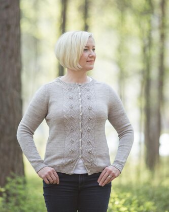 This is a light cardigan with a decorative lace panels on the fronts. The cardigan is worked from top down with contiguous sleeve shaping. Everything is worked seamlessly, you only have to pick a few stitches from the underarm. There is no shaping on the body, however shaping can be easily modified if preferred.