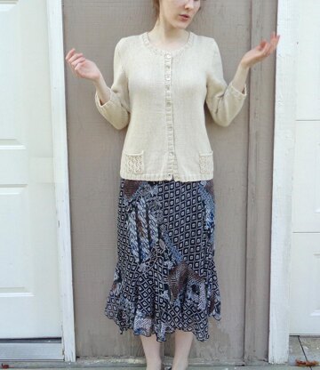 Vinca is a basic chic cardigan for warmer weather in a light cotton knit. Lacy pockets add a pretty touch.