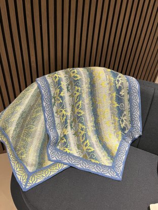 This version of “Vine Leaf Stole, light” makes a light, cooler garment than the warmer version “Vine Leaf Stole, Warm” It is knitted in Coast yarn (55% wool, 45% cotton) It is knitted in the round with steek stitches.
