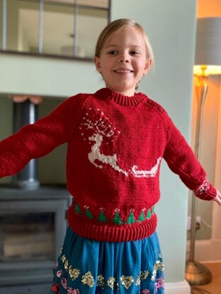 The Vintage Christmas Jumper was inspired by the jumpers my mother used to make in the fifties. The four larger sizes have a row of fir trees at the lower edge, a colourwork detail at the cuffs and a leaping reindeer pulling a sleigh on the front. It is knitted in parts from the bottom up and has a button fastening on the raglan so no tight necks to contend with. I have listed quantities of Debbie Bliss Rialto DK as it has a good stitch definition, comes in excellent colours and is soft and warm for children. Instructions range for approximate ages 1 - 9 years .