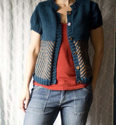 This vintage-feel cardigan has slightly capped short sleeves, a mandarin collar, rounded armholes, ribbed trim, and is designed to fit comfortably. It’s also got great detailing with the orange stripes worked on the fronts of the cardigan and an accent of purling to give the piece structure. It’s an easy-to-wear cardigan that will easily become one of your go-to pieces in your wardrobe.