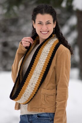 A simple stitch pattern and a retro color combination create a cozy, unisex scarf that can be worn straight or seamed into an infinity scarf.