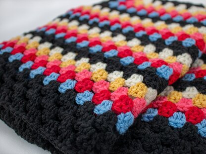 A cluster stitch consisting of three double crochets together. traditionally done in rounds of 3-4 to make small squares. The infinity Granny takes that same principal and just keeps going! Featuring a crochet blanket in Red Heart With Love in colors that gives a nod the OG Granny and its vintage scrap yarn colors.