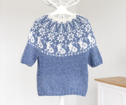 VINTERSKOG Bunny Icelandic Lopapeysa sweater is a unique design in the tradition of Icelandic knitting. The word «Vinterskog» means «winter forest» in Swedish. Body and sleeves are worked in the round from lower edge to underarms, then joined to work yoke in the round. Round begins at left side of body. On yoke, round begins on the left side of back at the joining of body and sleeve. For knitting the sleeves I recommend using the ‘magic loop’ technique, which helps you to avoid bunching up when enlarging and also saves your time.