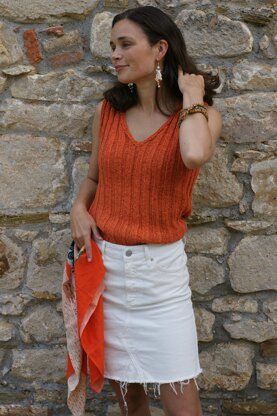 A smart sleeveless top in an elegant large ribbed pattern. To work in rounds until armholes. It is beautiful with the V-neck at the front and a nice crew neck on the back - or vice versa - both ways are very flattering. You can use the model alone as a top or as a slipover vest over a shirt. Inclosed in the pattern are instructions working the top flat for then to sew the side seams. Part of the Vinzeria-series which at the moment consists of 6 models. The model are suitable for all age groups. The measurements throughout the pattern are given in cm as well as inches.