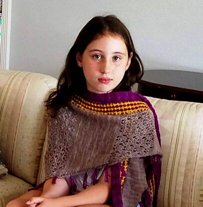 This pretty shawl is worked side to side, with panels of lace, in a gentle triangle shape. Then it has two knitted-on borders at the top edge.