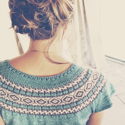 Virgil is a universally flattering top, designed to celebrate and highlight the beauty of all women and all body types. The gentle shaping is naturally formed by the slightly tighter tension of the colorwork bands, bringing stability and fit to the yoke and waist and allowing the bust and sleeves to flow easily and comfortably over the body. The sample was knit in Vixen by Little Fox Yarn- a super soft merino/silk blend which drapes beautifully and is delightful to wear against the skin.