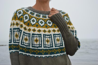 Vitrage is a poncho style sweater. Knit from the top down in the round it requires no seaming. The deep yoke features various color work motifs inspired by stained glass windows. Fitted sleeves with long ribbed cuffs balance out the oversized, comfy body. Knit up in O-Wool ‘O-Wash Fingering’ yarn, there are endless color combinations to choose from. This sweater is a statement piece that is fun to knit and show off as you mix and match it into your wardrobe!