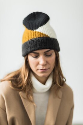 NOTES Worked from the brim to the crown in k1, p1 rib. Color sections are worked using the intarsia in the round technique. See Video for understanding in pattern for understanding. Separate the CC2 hank into two separate balls of 25 gr each. Choose the size with 2–3” negative ease.
